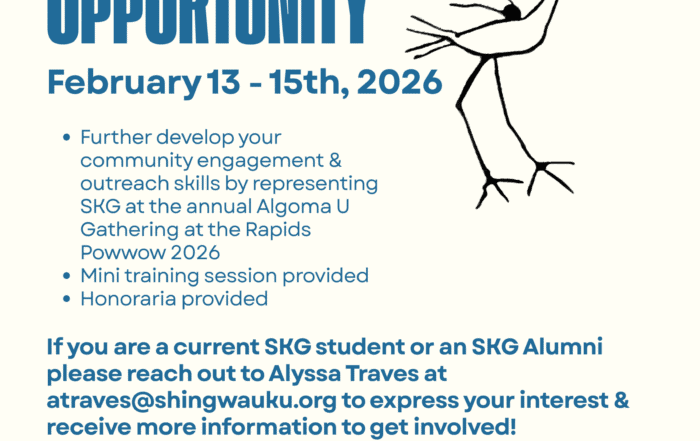Shingwauk Kinoomaage Gamig (SKG) – Shingwauk Teaching Lodge is a teaching and research centre of excellence in Anishinaabe education. As an Anishinaabe post-secondary institute, SKG preserves the integrity of Anishinaabe knowledge and understanding aiming to educate the present and future generations in a positive, cooperative and respectful environment. Founded based on a vision of the Ojibwe Chief Shingwaukonse’ibun to create a Teaching Wigwam with an overall goal of providing Anishinaabe Education; SKG provides and develops academic programs, workshops and seminars which reflect the Anishinaabe worldview, distinguished by Anishinaabe ways of learning and knowing. We are one of nine Indigenous institutes of higher learning that are recognized in Ontario and also home to the National Chiefs’ Library.