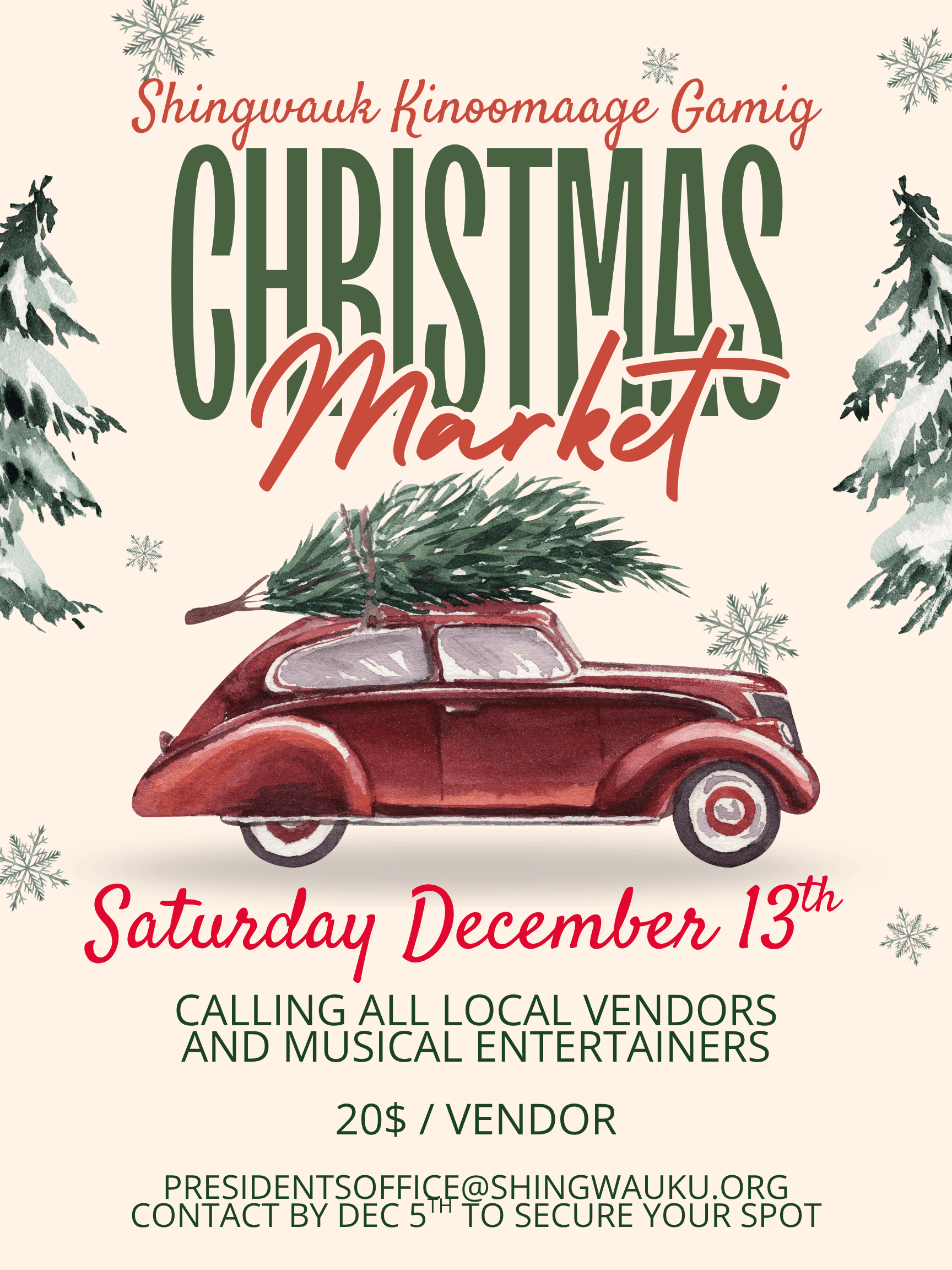 UPDATE: Only 10 vendor spots left — email presidentsoffice@shingwauku.org to reserve your table before they’re gone! 🎄✨
